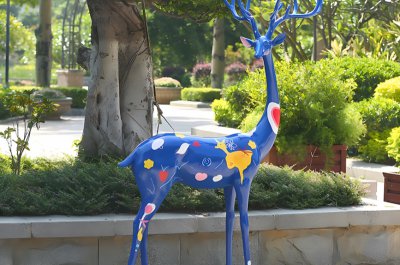 在园林街道上,玻璃钢彩绘的蓝色梅花鹿雕塑,以其清新的色彩和优雅的造型,为街道景观带来了一抹宁静与和谐。蓝色调与周围的自然环境相得益彰,雕塑不仅美化了环境,也成为了街道上的一处标志性景观。
